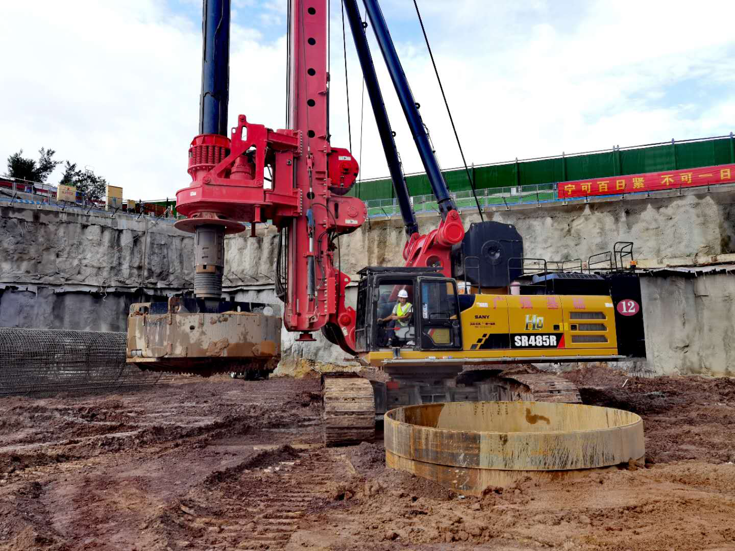 “万象天汇广场”项目是保利控股集团投资建设的又一重点项目,我司承建了该项目的桩基础工程。该项目是在负12米的基坑底施工,场地面狭小,地质情况复杂,沙层厚、各类夹层多、钻入困难、机械作业难度非常大。广强基础公司各类技术人员以高起点策划、高水平组织、高质量施工为目标,结合多年的实践和积累的施工经验,最终设计出利用长护筒加干成孔的工艺,因地制宜,投入公司自有设备三一超大型SR485R(重型)旋挖钻机进行施工。为确保大桩径灌注成桩质量,工程技术总监和相关技术人员驻扎现场指挥,从材料和工序源头上进行严格把关,不仅保证了施工安全和质量,也大幅提高了施工效率。